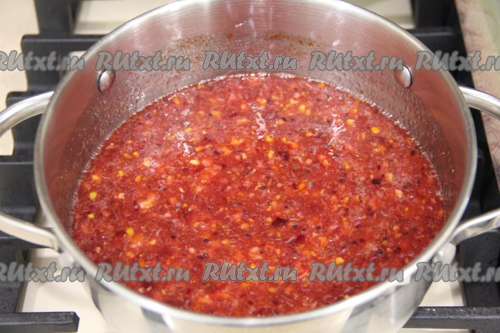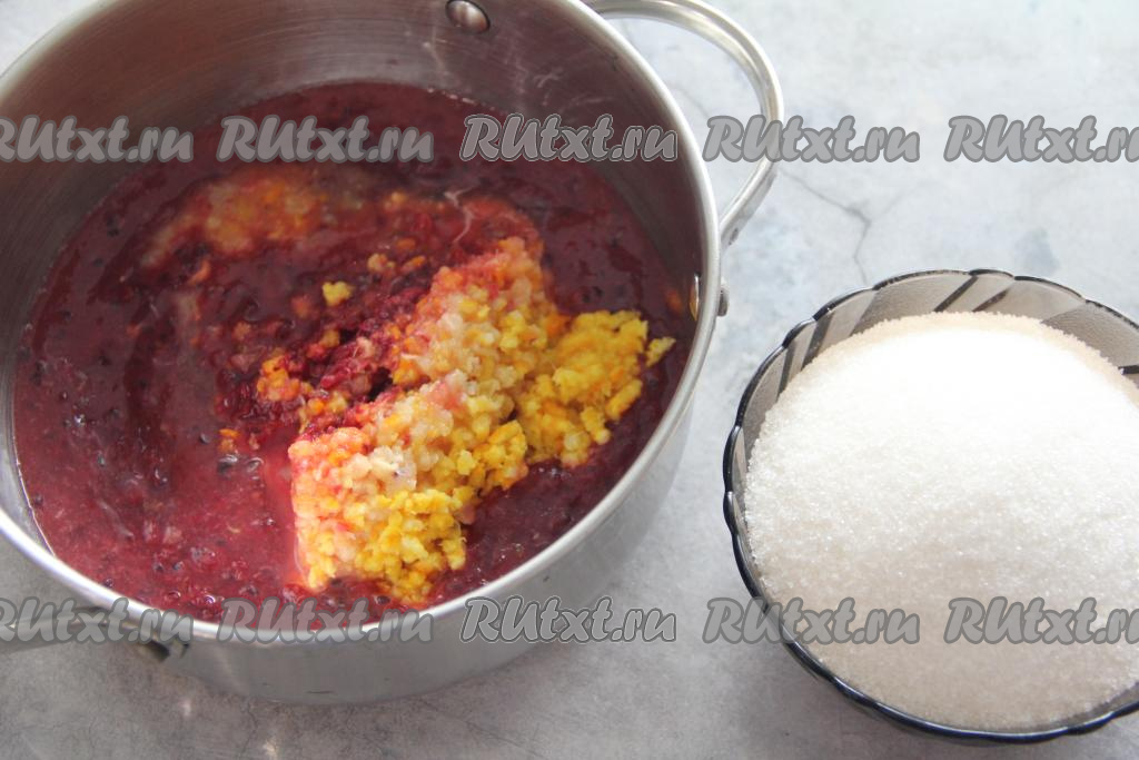 В кастрюлю с ягодно-фруктовой массу добавить сахар, перемешать и поставить на средний огонь.