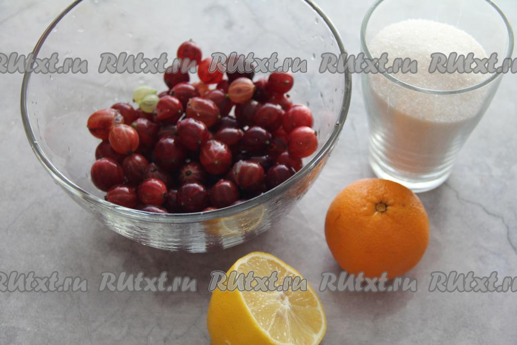 Ягоды крыжовника перебрать, удаляя веточки и соцветия. Затем переложить крыжовник в дуршлаг, промыть водой и оставить ягоды на несколько минут в дуршлаге, чтобы с них стекла вода. Апельсины и лимон очень хорошо промыть водой.