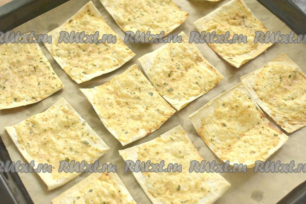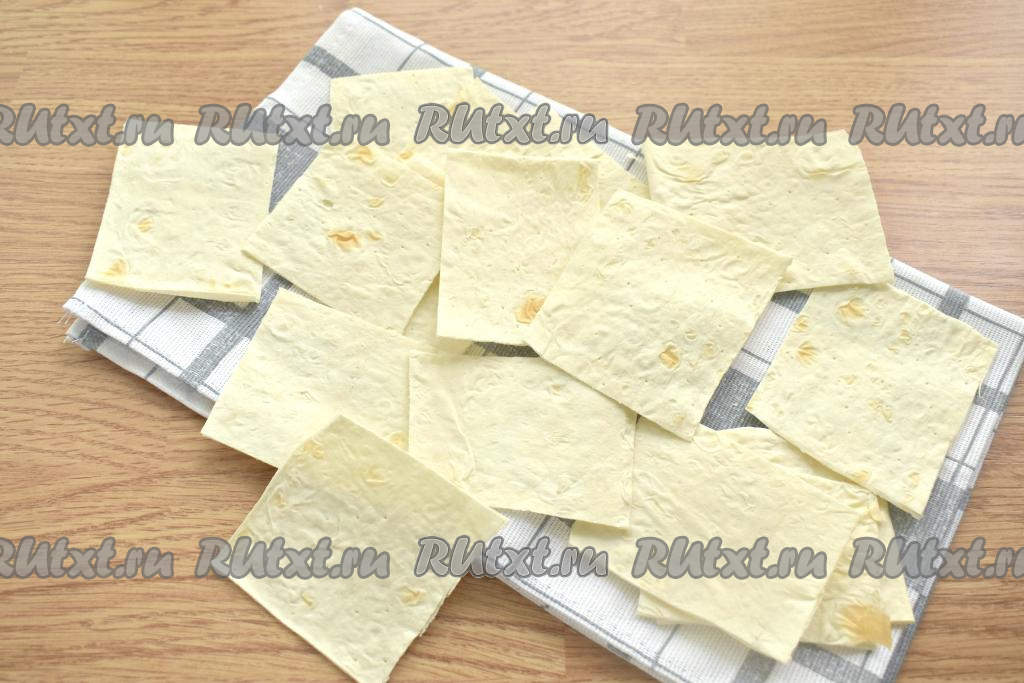 Тонкий лаваш нарезаем на квадраты или прямоугольники со сторонами примерно 4-5 сантиметров.