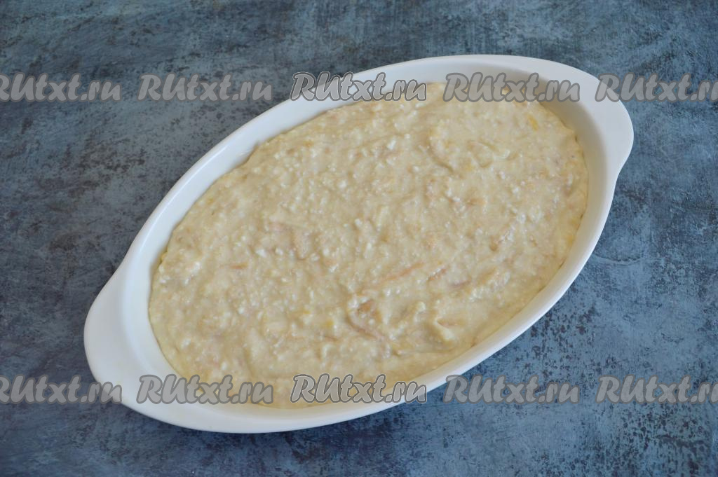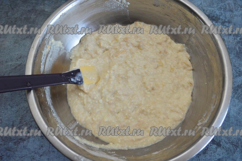 Творожное тесто для приготовления запеканки с яблоком и бананом должно получиться однородным, напоминающим сметану средней густоты. Тесто будет медленно стекать с ложки.