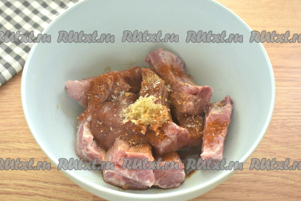 Свиные рёбра ополаскиваем водой и нарезаем по мягкой части мяса на порционные кусочки.