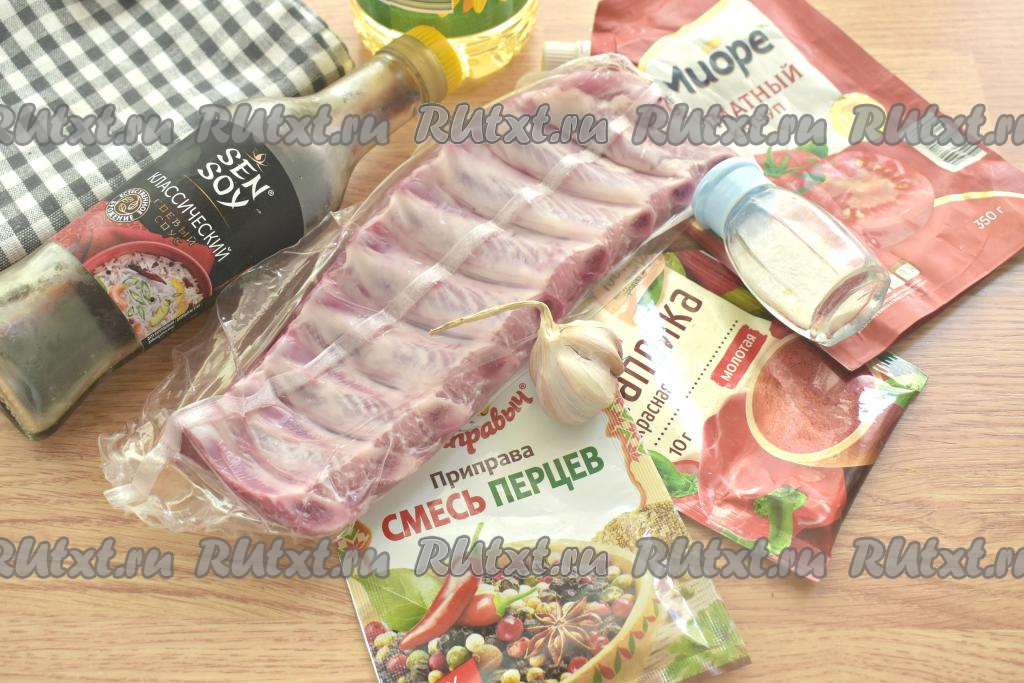 Рёбрышки складываем в миску, вливаем к ним соевый соус и добавляем кетчуп (или томатный соус), пропущенные через пресс (или натёртые на мелкой тёрке) зубчики чеснока, всыпаем специи, немного солим (помним, что мы используем соевый соус, который достаточно солёный).