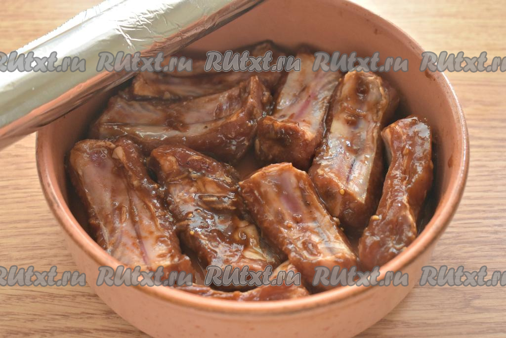 Рёбрышки хорошо перемешиваем, покрывая их соевым соусом, кетчупом (или томатным соусом) и специями со всех сторон. Отправляем рёбра промариноваться в холодильник на 2-3 часа. За это время рёбрышки пару раз нужно перемешать.