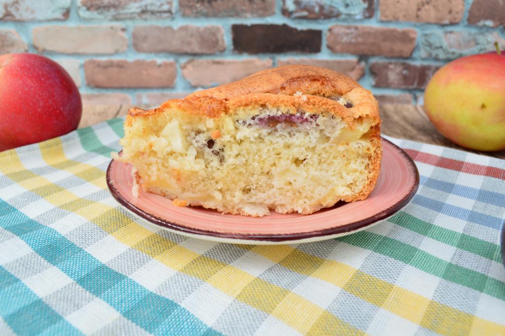 А вот как нежная, мягкая шарлотка с яблоками и сливами выглядит в разрезе. Воздушный бисквит с большим количеством фруктов, покрытый аппетитнейшей золотистой корочкой, - это очень вкусно!