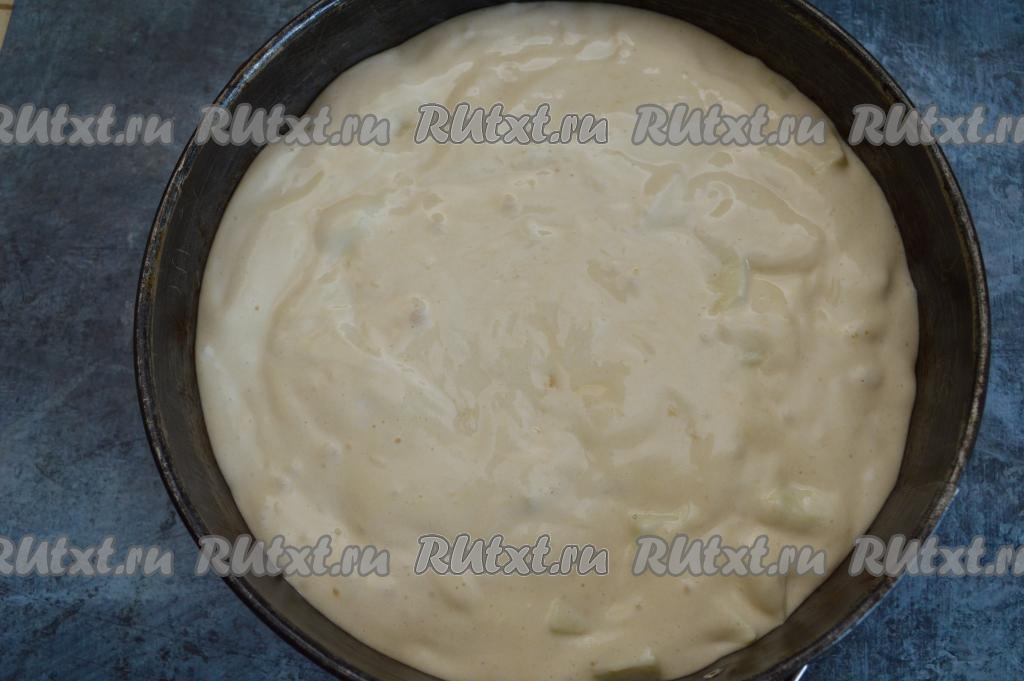 Форму для выпечки (я взяла разъёмную форму диаметром 23 сантиметра) застелите пергаментом, смажьте бока и низ формы небольшим кусочком сливочного масла. Переложите в форму бисквитное тесто, смешанное с яблоками.