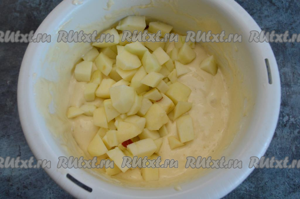 Яблоки очистите от кожуры и семечек, нарежьте на кубики размером примерно 1,5 на 1,5 сантиметра. Вмешайте яблоки в тесто при помощи лопатки.