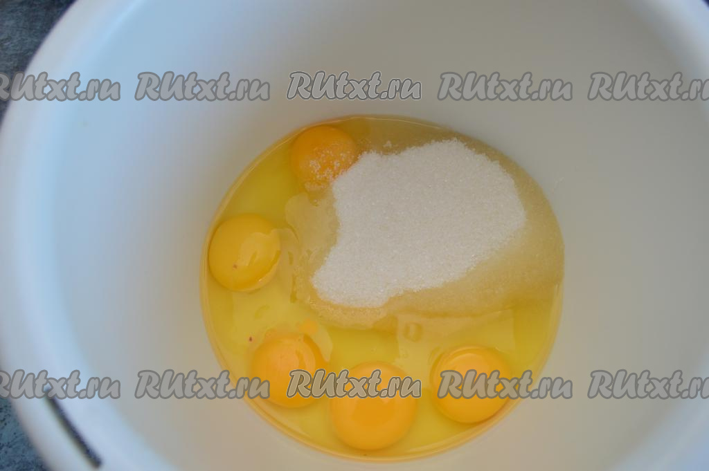 В чашу миксера вбейте сырые яйца и всыпьте сахар.