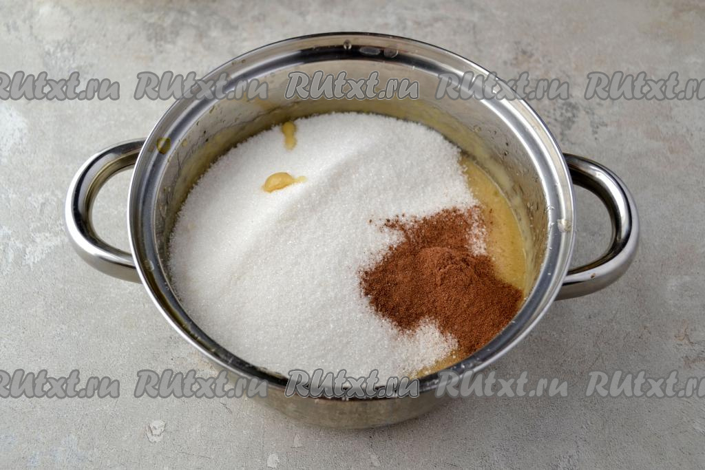К яблочному пюре всыпьте сахар и молотую корицу, тщательно перемешайте и поставьте на средний огонь. Доведите, постоянно помешивая, до кипения на среднем огне, а затем, сделав огонь минимальным, варите 5-7 минут, помешивая.