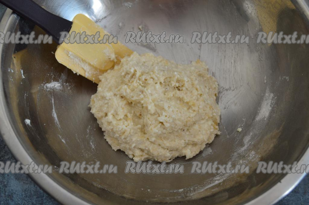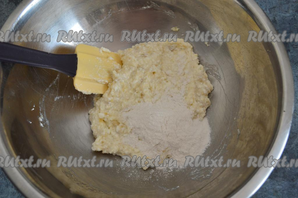 Лопаткой вмешать рисовую муку в тесто. По столовой ложке добавляя муку и вмешивая её в тесто, нужно добиться, чтобы тесто для сырников получилось липким, но при этом тесто должно держать форму при формировании сырника. Я получила нужную консистенцию теста после добавления 2 столовых ложек рисовой муки (я дополнительно взвесила добавленную муку, получилось 40 грамм). Вам, возможно, потребуется рисовой муки чуть больше или меньше, ведь многое зависит от влажности творога.