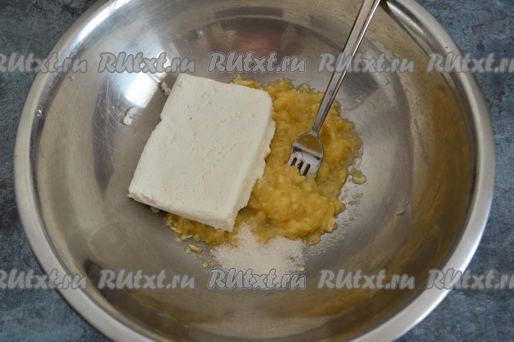 В миску с банановым пюре всыпать сахар и выложить творог.