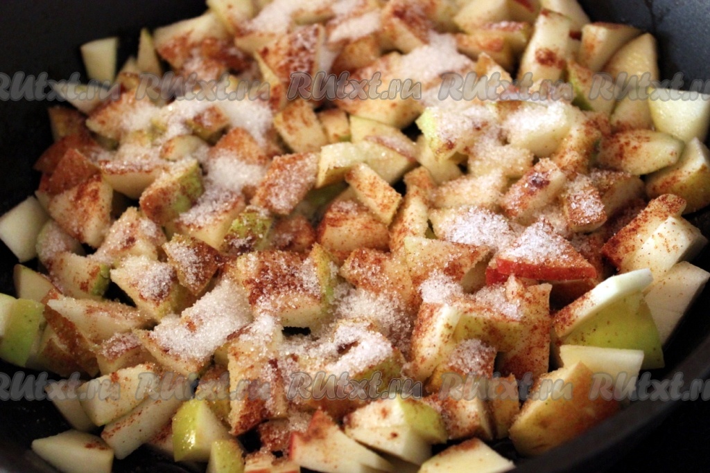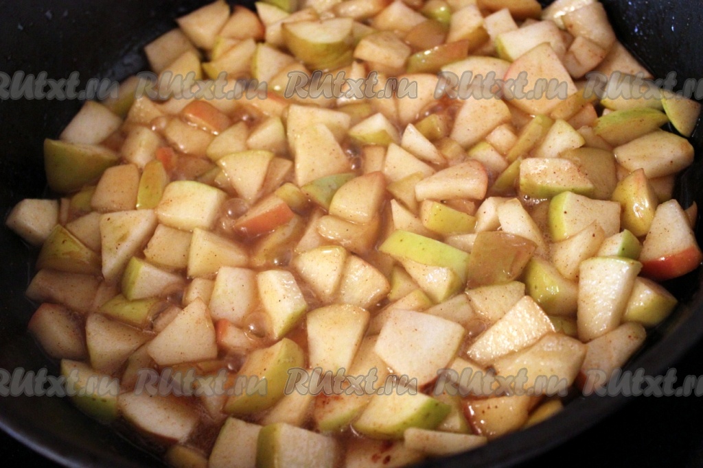 Для приготовления начинки нужно яблоки нарезать на кусочки, посыпать сахаром и корицей и потушить на сливочном масле на среднем огне.