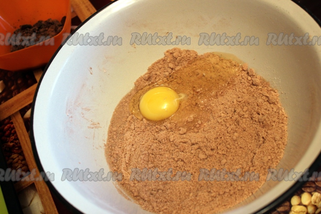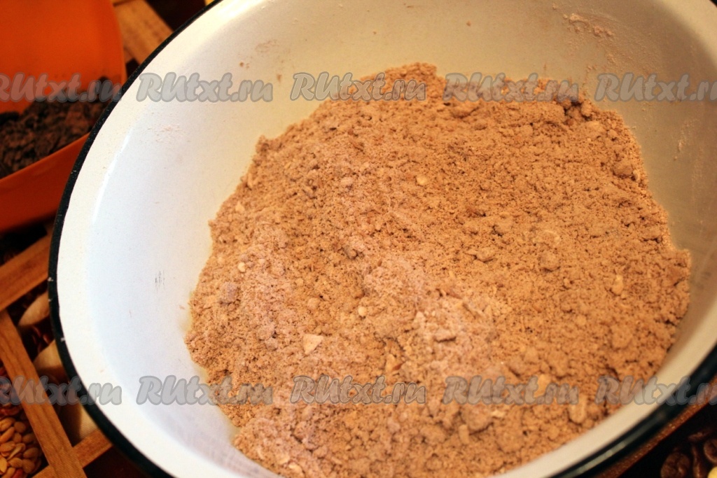 Для приготовления теста-крошки тёртый маргарин нужно размешать с мукой, сахаром, разрыхлителем и какао.