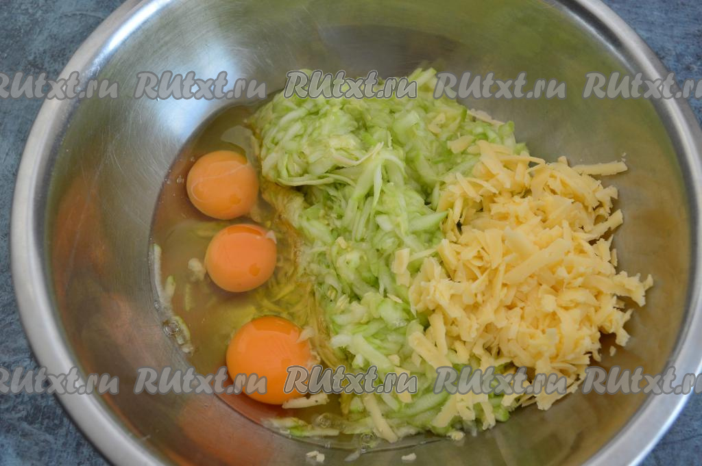 Сыр натереть на крупной тёрке. К кабачковой массе, отжатой от сока, добавить сырые яйца и половину натёртого сыра, тщательно перемешать (до однородности).