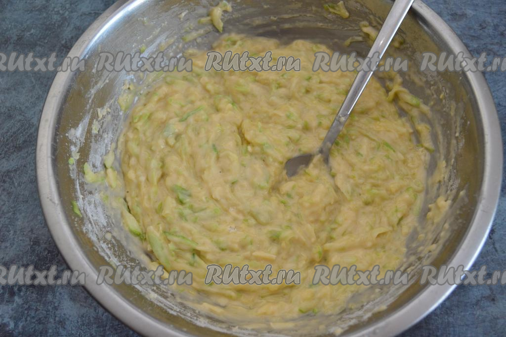 В получившуюся кабачково-сырную массу всыпать 100 грамм муки, перемешать.