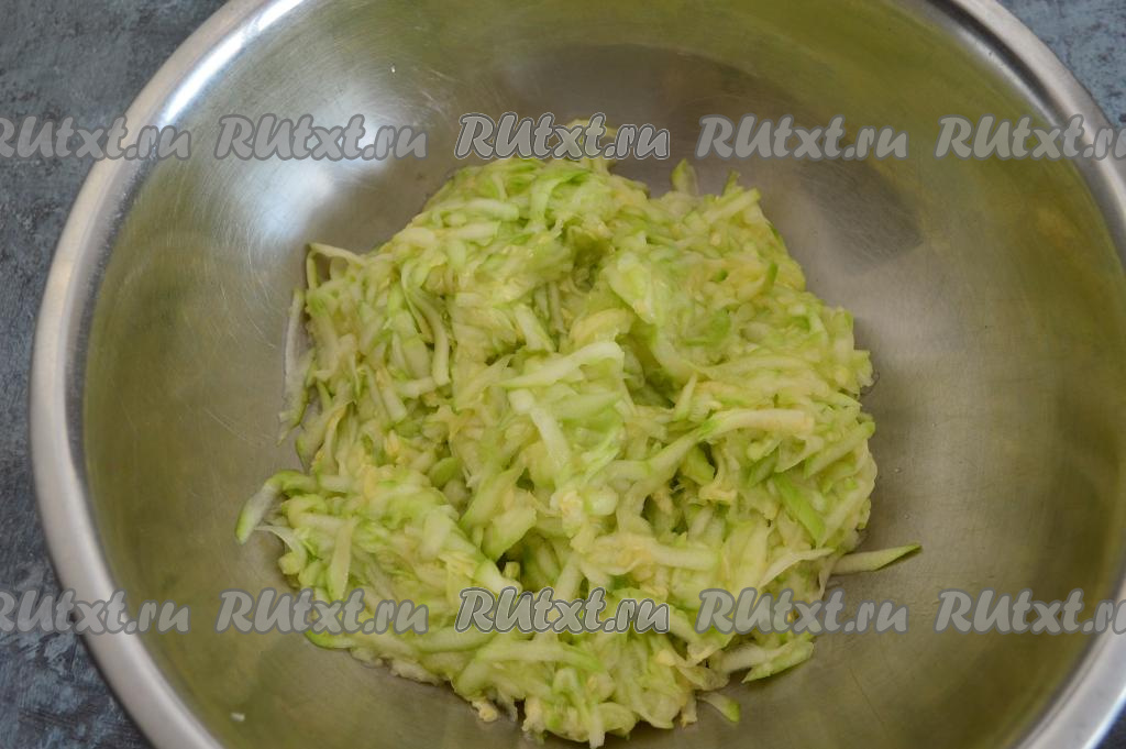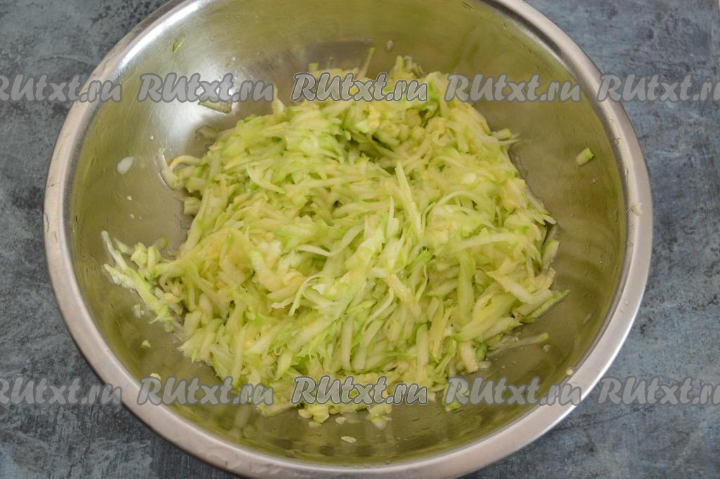 Оставить кабачковую массу на 5 минут, чтобы кабачок пустил сок. Затем, беря в руку понемногу кабачковой массы, отжать из кабачка выделившийся сок.