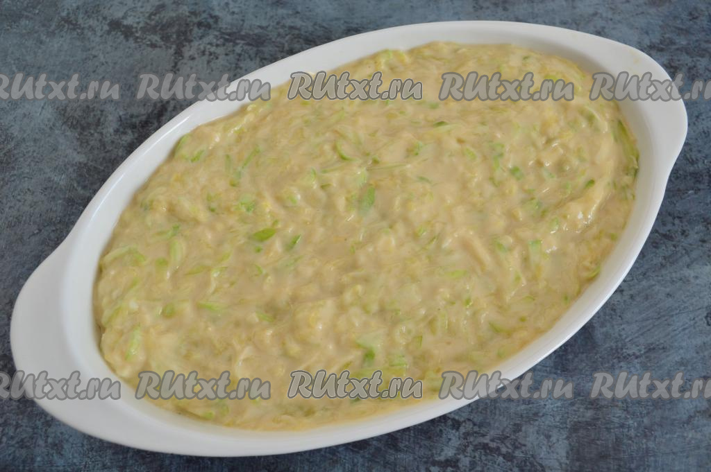 Подходящую по размерам форму для запекания (я в этот раз взяла овальную форму размером 26 на 16 сантиметров) смазать растительным маслом. Выложить в форму кабачково-сырное тесто и равномерно распределить.