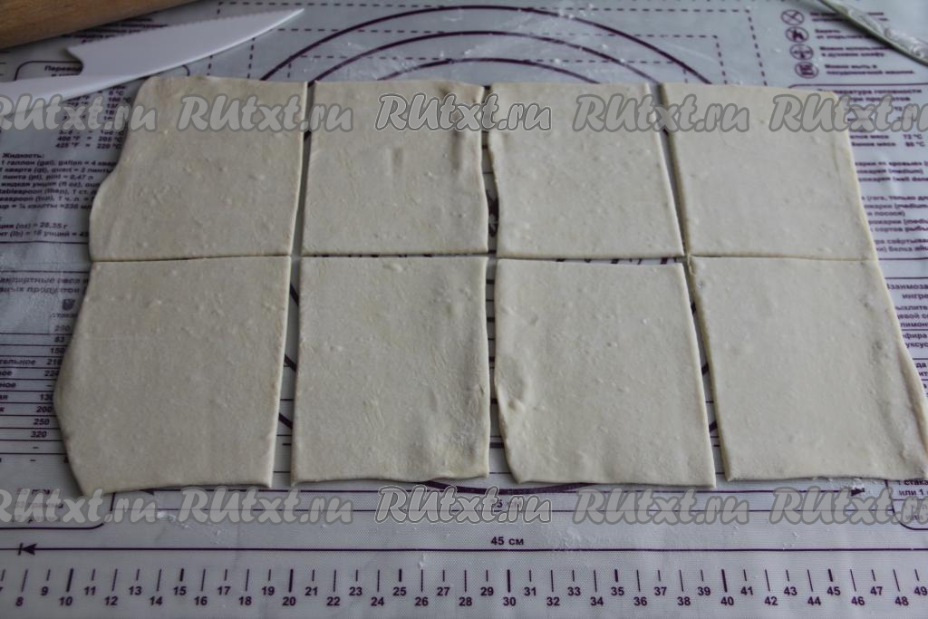 Каждый пласт разрезать на 4 части (в результате у нас получатся 8 слоёных пирожков).