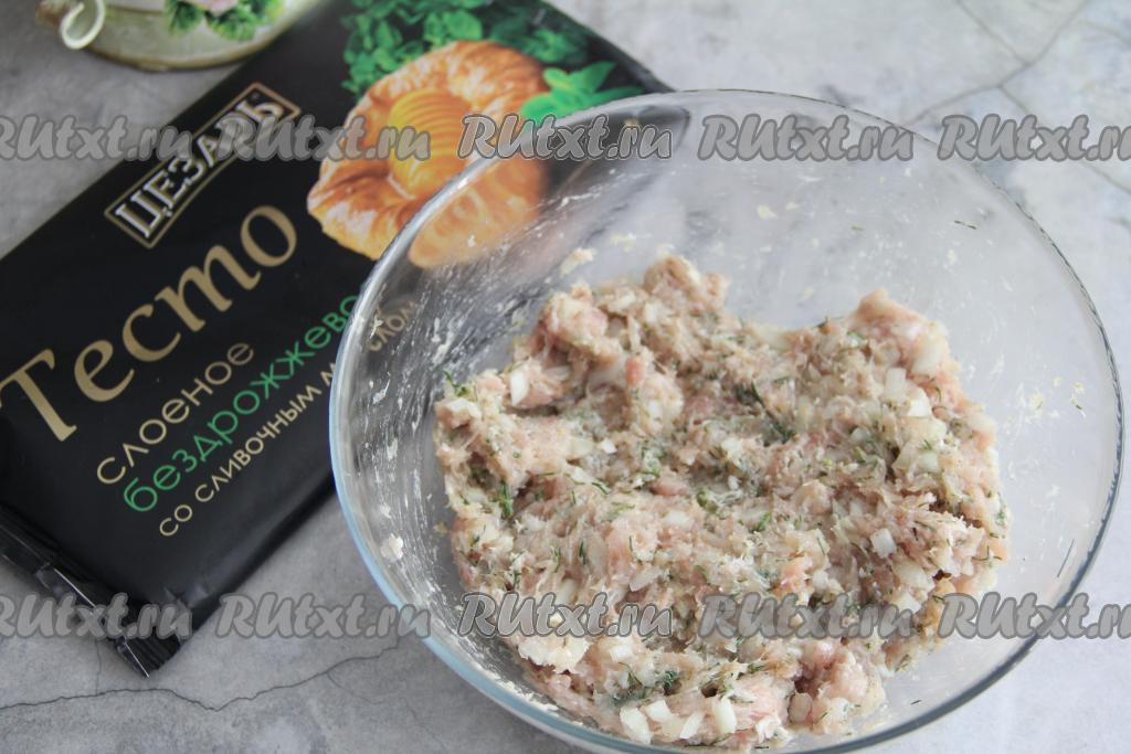 Разморозить слоёное тесто при комнатной температуре. Мясо (у меня - куриное филе) вымыть, обсушить, пропустить через мясорубку и переложить в объёмную миску. Для приготовления слоёных пирожков можно взять и покупной фарш. Лук почистить, мелко нарезать, выложить к фаршу.