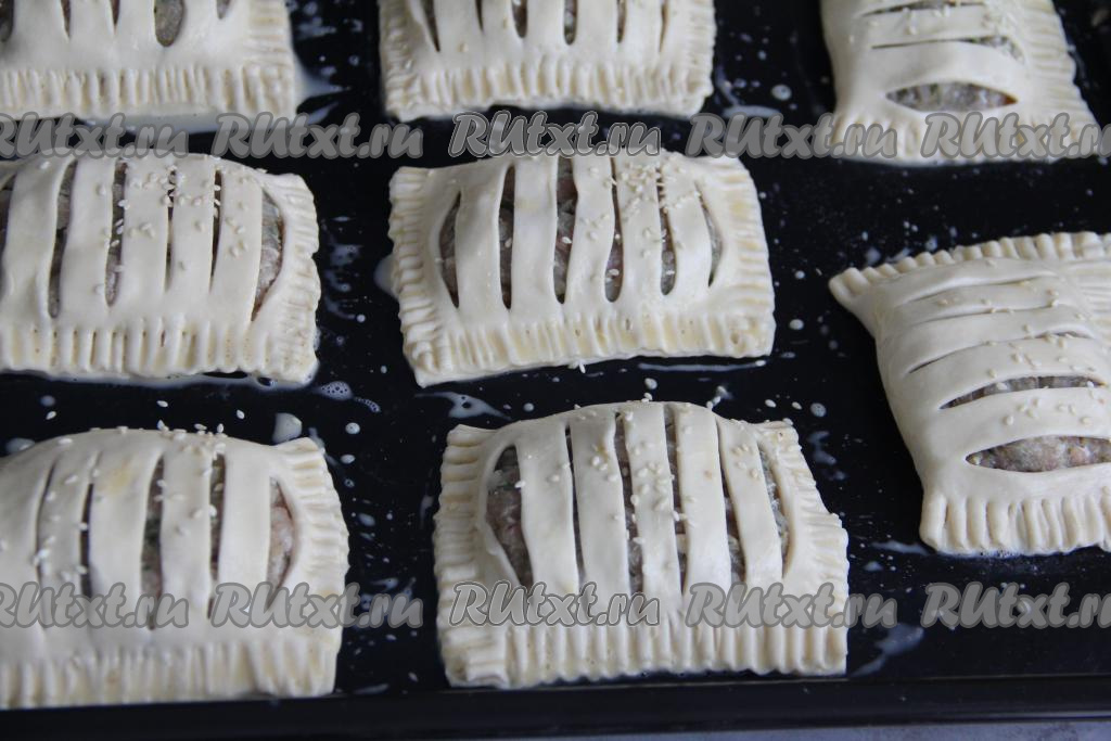 Тщательно скрепить края каждого пирожка с помощью вилки (если вилка будет сильно липнуть к слоёному тесту, тогда слегка обмакните её в муку). Переложить пирожки с фаршем на противень, заранее застеленный ковриком (или пергаментом) для выпечки. Яичный желток в небольшой ёмкости слегка взбить вилкой. Сверху смазать пирожки взбитым желтком.