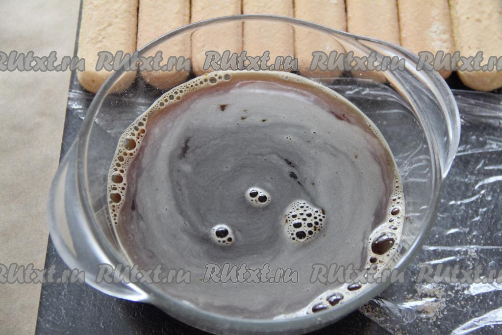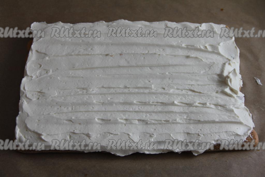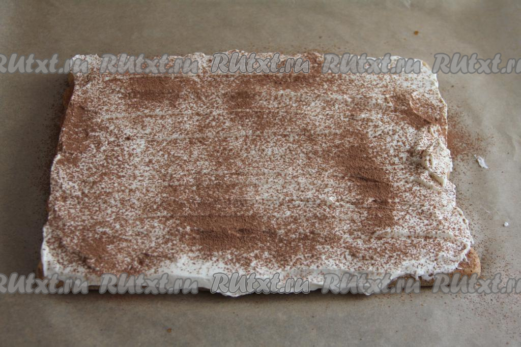 Смазать печенье кремом из взбитых сливок и маскарпоне. Немного крема оставьте для покрытия тирамису перед подачей, уберите этот крем в холодильник.