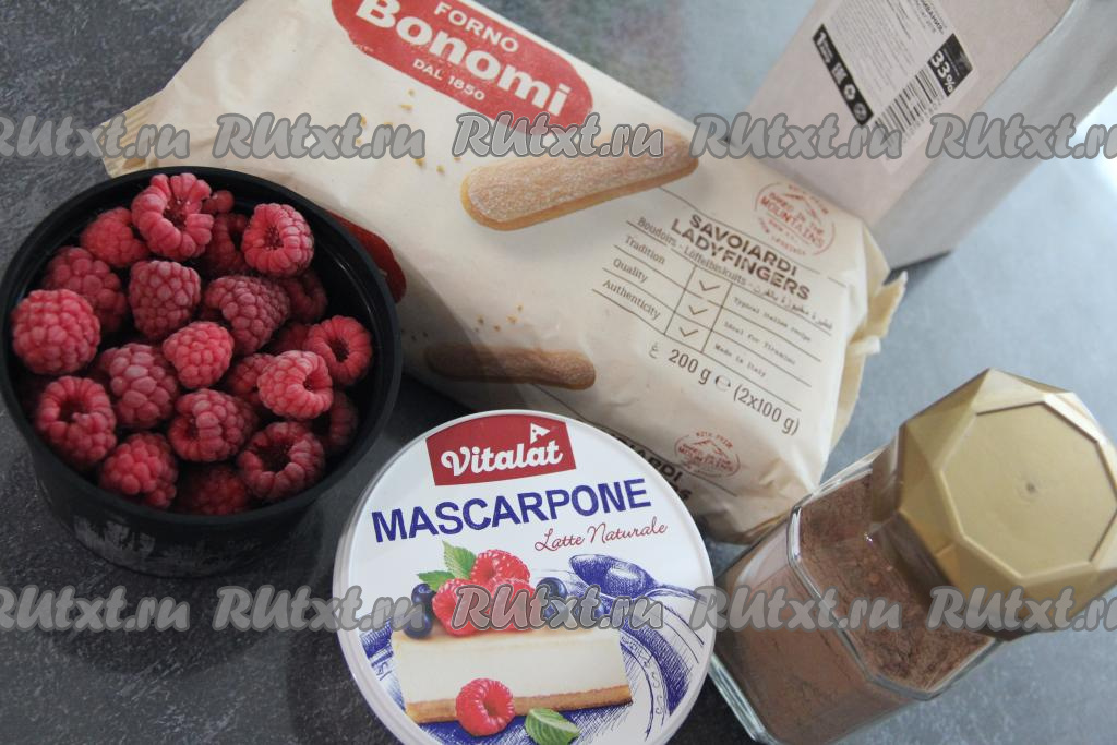 Подготовить продукты. Сливки для приготовления тирамису нужно брать жирностью не менее 33%, они должны быть хорошо охлаждёнными. Малину для этого десерта можно взять свежую или замороженную. Если ягоды свежие, их нужно промыть и обсушить. Замороженную малину нужно разморозить при комнатной температуре, лишнюю воду слить.