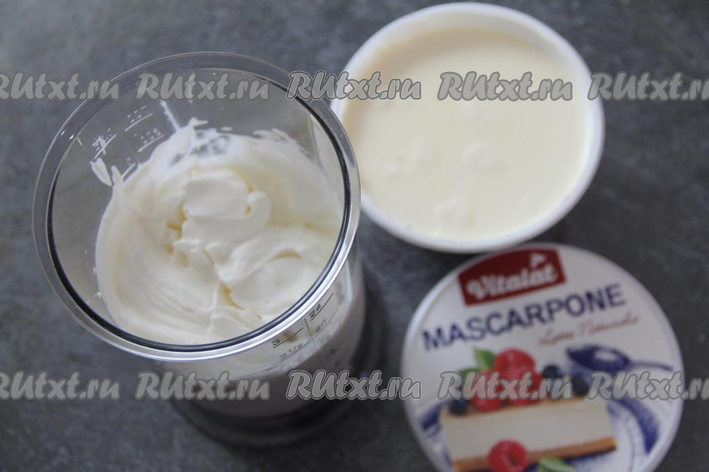 В чашу, в которой будет удобно взбивать миксером, влить очень холодные сливки, всыпать сахарную пудру, взбить миксером до мягких пиков. Затем добавить маскарпоне и перемешать миксером до получения однородного, нежного крема.