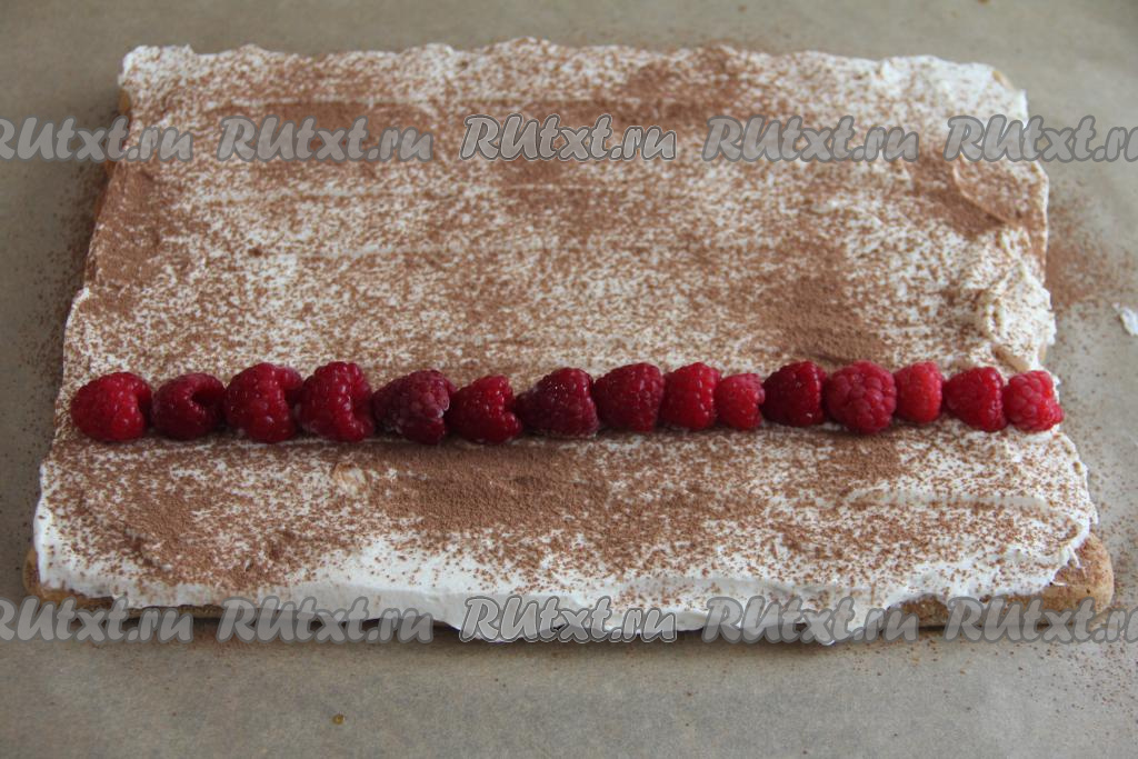 Малину выложить одной плотной полоской ближе к одному длинному краю. Можно выложить малину вразнобой.