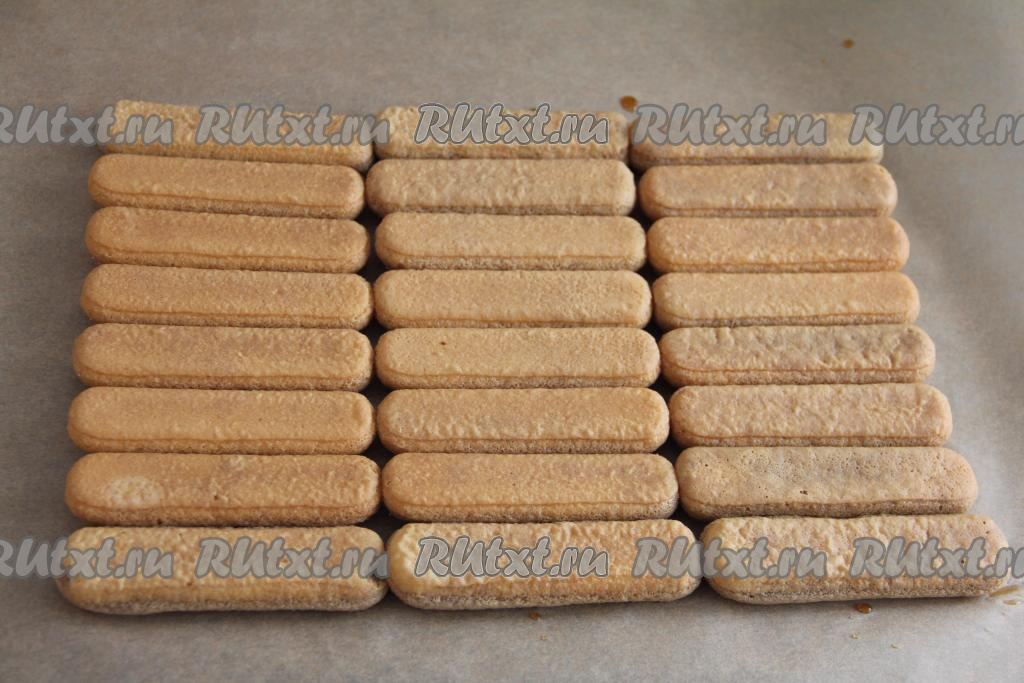 Я решила сформировать десерт "Тирамису" в виде рулета. Для этого стол нужно застелить пергаментом. Полностью окунуть каждое печенье "Савоярди" в кофе и выложить на пергамент в один слой, как на фото.