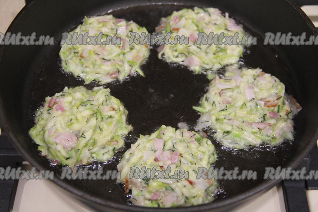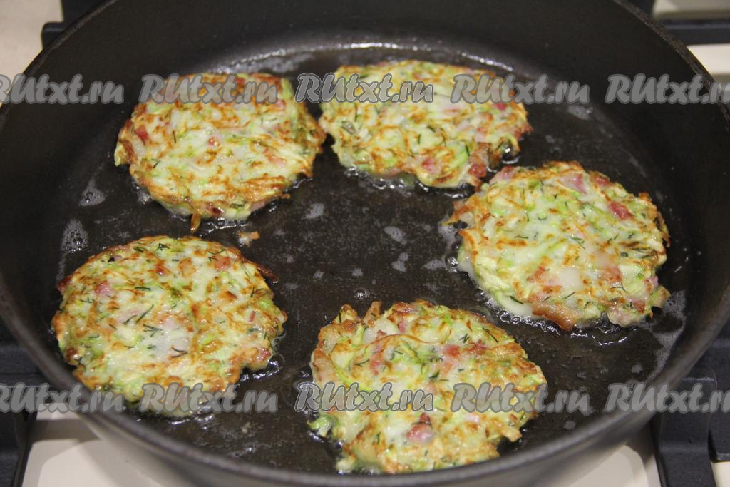 В сковороду влить растительное масло и хорошо разогреть. Выкладывать по 1 столовой ложке кабачкового теста с беконом в виде круглых оладий.