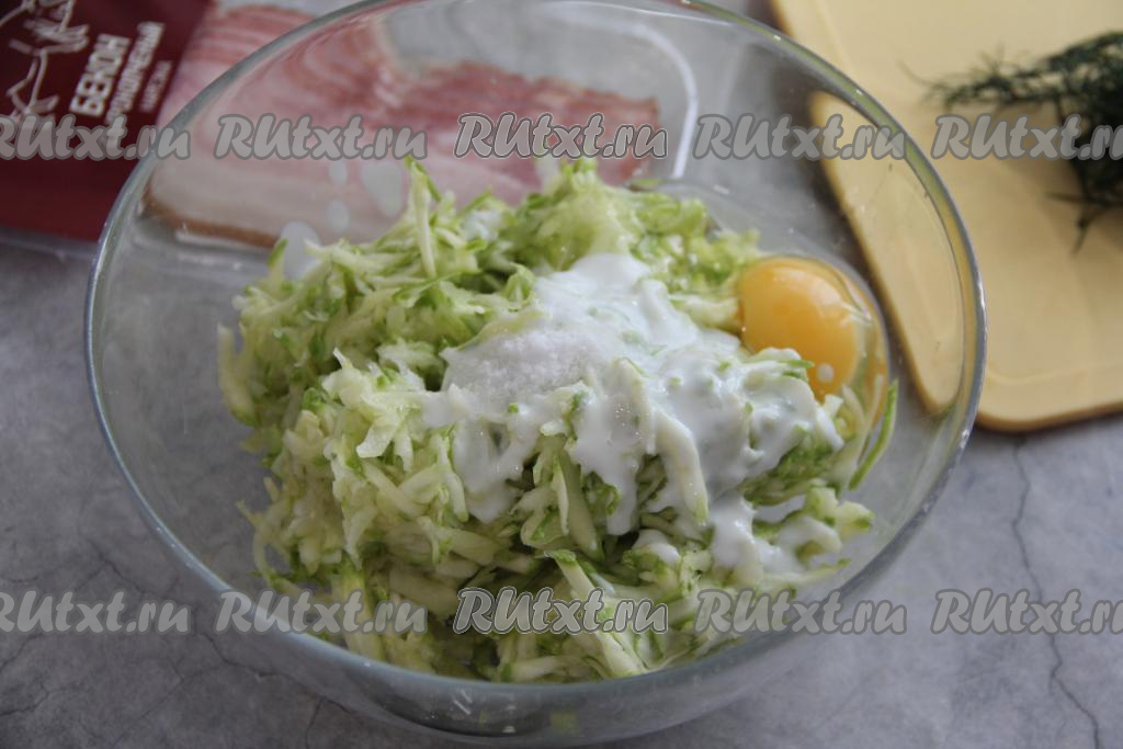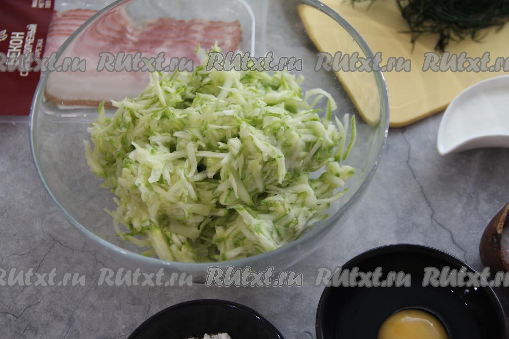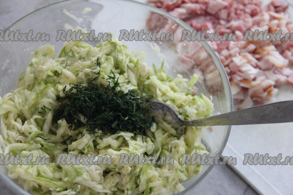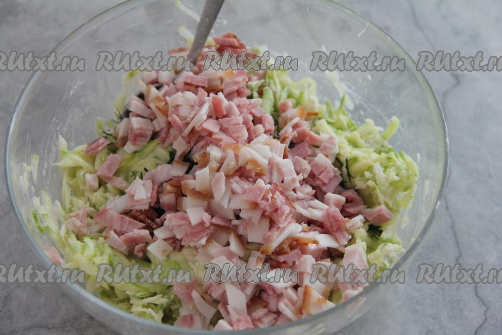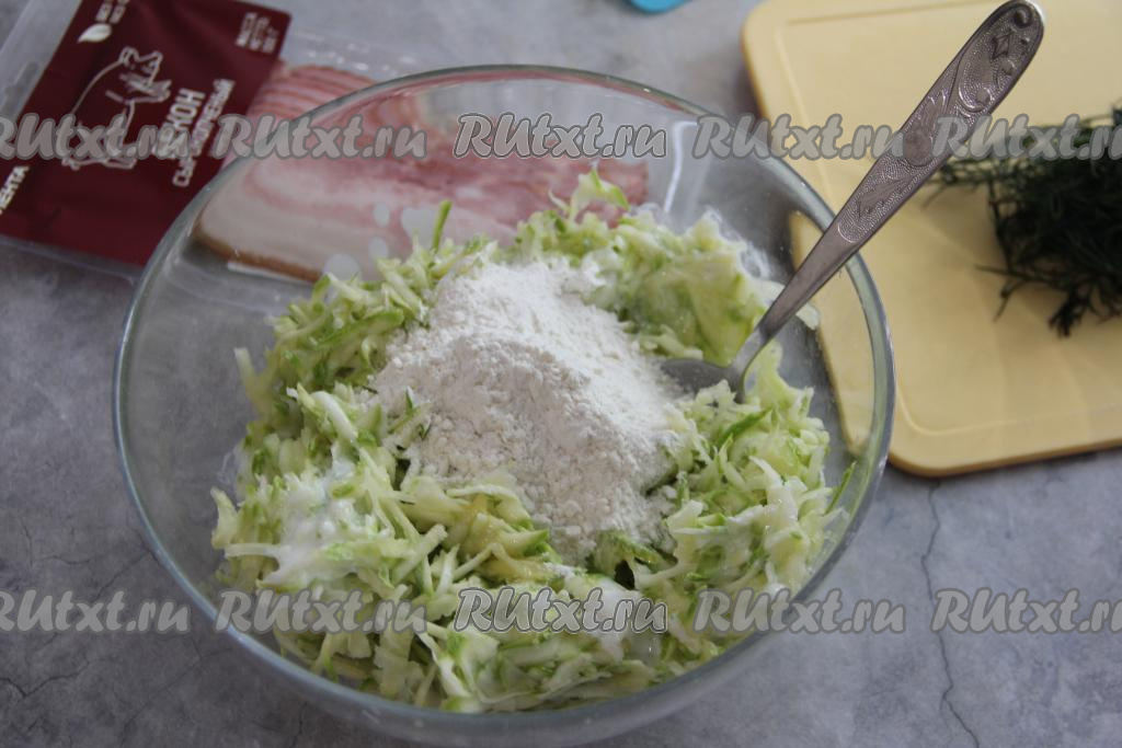 Бекон нарезать на тонкие брусочки и добавить в кабачковое тесто.