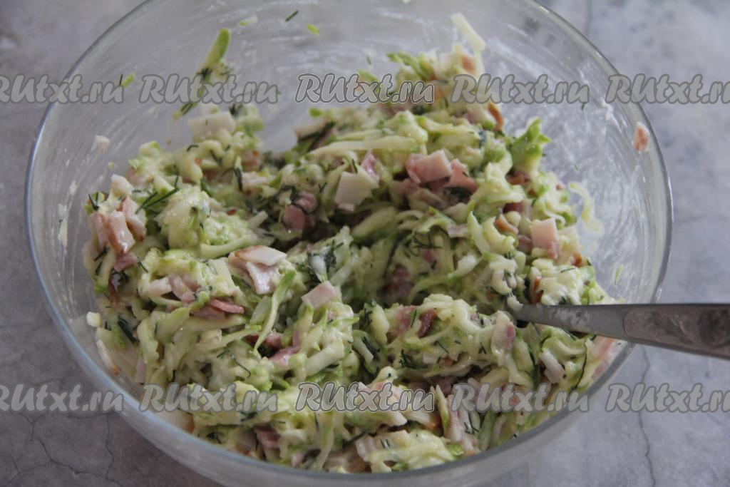 Перемешать получившееся тесто для оладий из кабачков с беконом.