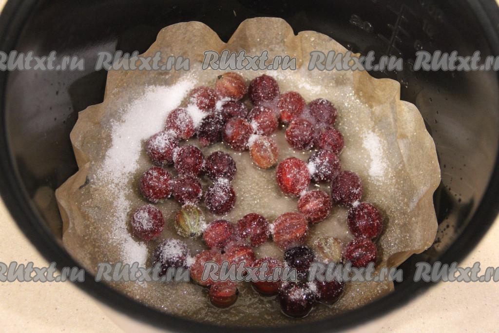Дно чаши мультиварки застелить пергаментом. Выложить подготовленный крыжовник в один слой, присыпать ягоды 1 столовой ложкой сахара.