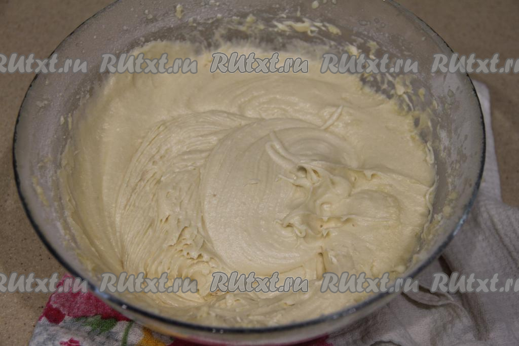 Всыпать разрыхлитель и половину муки, перемешать миксером. Затем частями всыпая оставшуюся муку и вмешивая её миксером, замесить однородное, не очень густое тесто, как на фото. Муки может потребоваться немного больше или меньше, главное - ориентироваться на консистенцию теста, которое вы замешиваете.