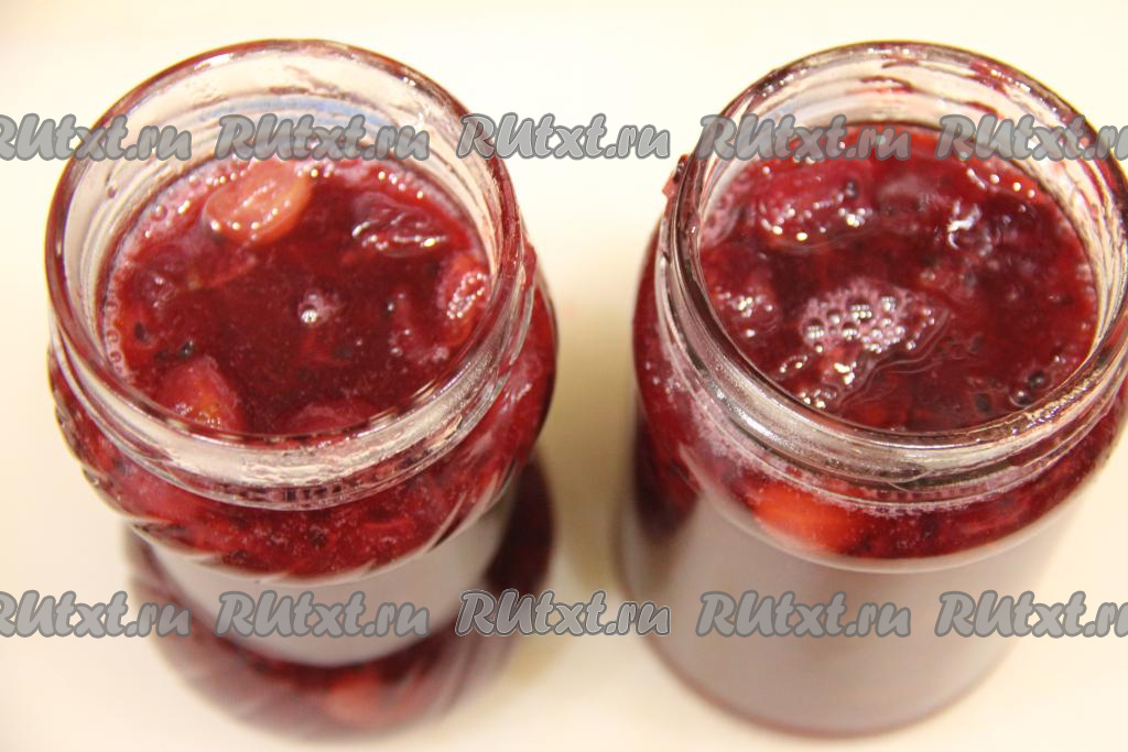Банки заранее простерилизовать удобным для вас способом, крышки прокипятить в течение 4-5 минут с момента закипания воды. Разложить горячее варенье по подготовленным сухим банкам. У меня получилось 2 банки варенья по 250 миллилитров и 1 банка объёмом 300 миллилитров. Закрутить банки (или закатать) крышками и перевернуть кверху дном. Укутать банки с вареньем в одеяло и оставить до полного остывания, а затем переставить на хранение в прохладное место (например, в кладовку или в подвал).