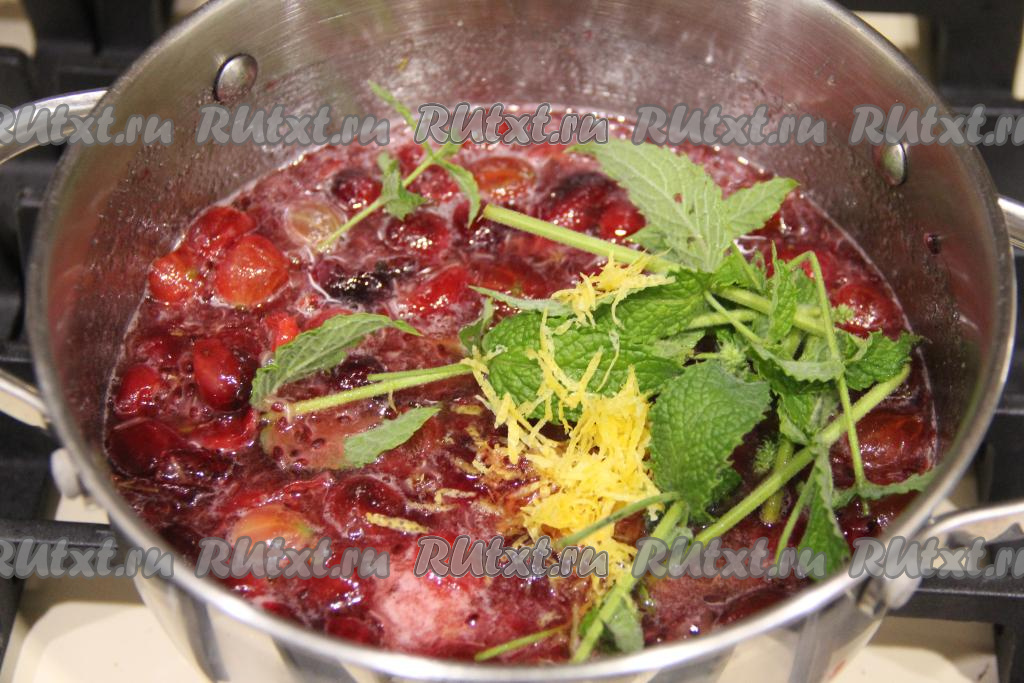 С половины лимона снять цедру (снимая жёлтую цедру, старайтесь не затрагивать, находящийся под ней белый слой) и выдавить сок. Добавить в кастрюлю веточки мяты, сок и цедру из половины лимона.