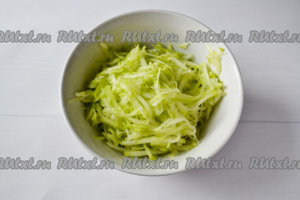 Кабачок вымойте, очистите от кожуры, если семечки крупные, их нужно будет удалить. Натрите кабачок на крупной тёрке. Оставьте на 10 минут, чтобы кабачок пустил сок.
