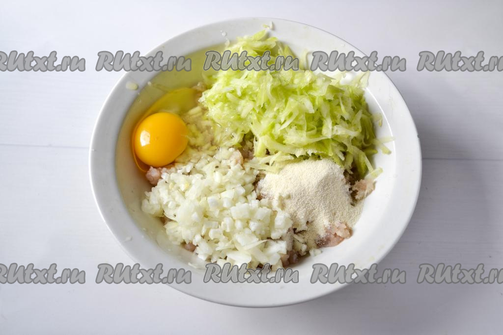 Затем из натёртого кабачка отожмите руками сок. Для приготовления котлет потребуется 300 грамм кабачка, отжатого от лишнего сока. В миску с щучьим фаршем добавьте отжатый кабачок, сырое яйцо, очищенный и мелко нарезанный лук, всыпьте манную крупу, посолите по вкусу.