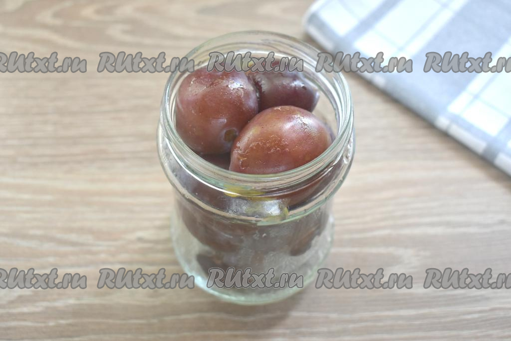 Подготовленные сливы перекладываем в простерилизованную банку, аккуратно заполняя баночку до самого верха.