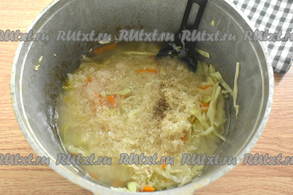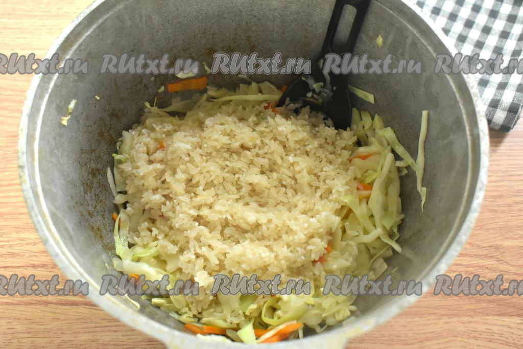 Сухой рис насыпаем в сито, несколько раз промываем под проточной водой и оставляем на несколько минут, чтобы с него стекла лишняя вода. К капусте, обжаренной с луком и морковью, выкладываем рис, солим, перчим.