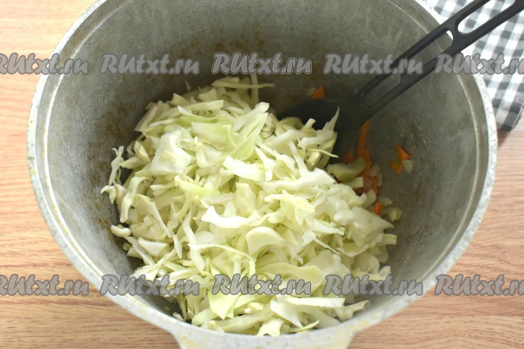 К обжаренным моркови с луком выкладываем капусту, нарезанную на тонкие полоски, перемешиваем и обжариваем под крышкой 7 минут, время от времени перемешивая.