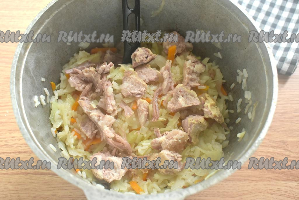 К тушёной капусте и рису добавляем кусочки тушёнки без жира, перемешиваем, готовим 5-7 минут под крышкой и убираем с огня.