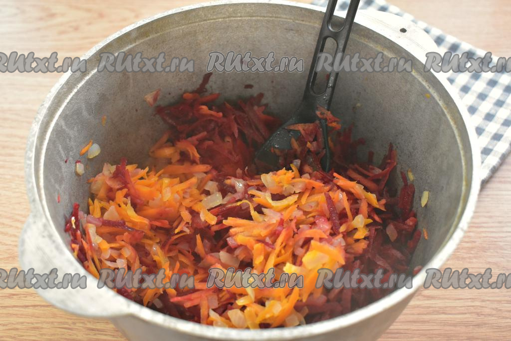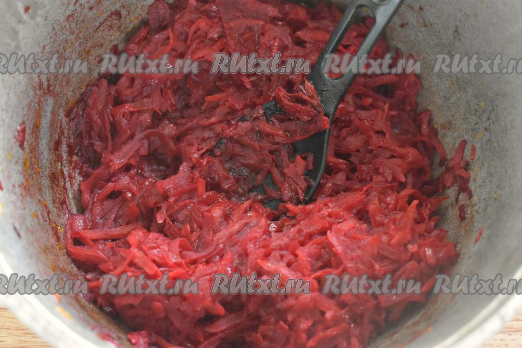 Затем к обжаренным овощам выкладываем натёртую свеклу, перемешиваем и обжариваем, иногда помешивая, 5 минут.