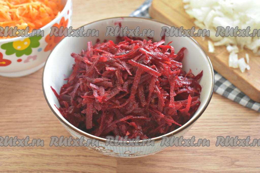 Очищенную свеклу тоже натираем на крупной тёрке.