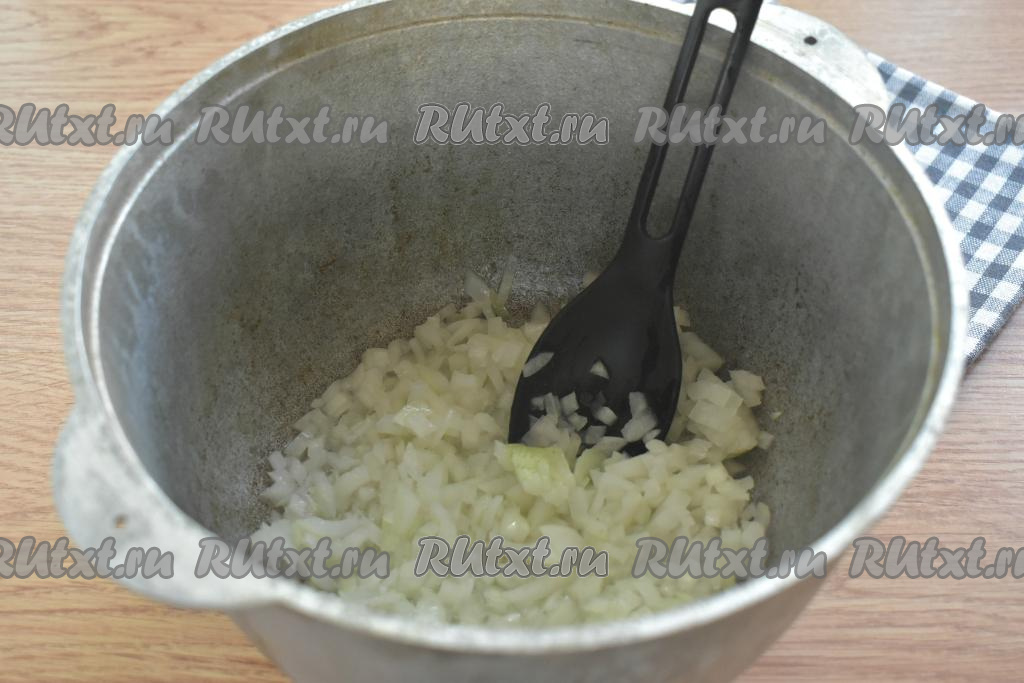 Я готовила зажарку для борща в казане, подойдёт также глубокая сковорода. Вливаем в казан (или глубокую сковороду) растительное масло, хорошо разогреваем его, выкладываем нарезанный лук, обжариваем его на среднем огне до мягкости (3-4 минуты), иногда помешивая.
