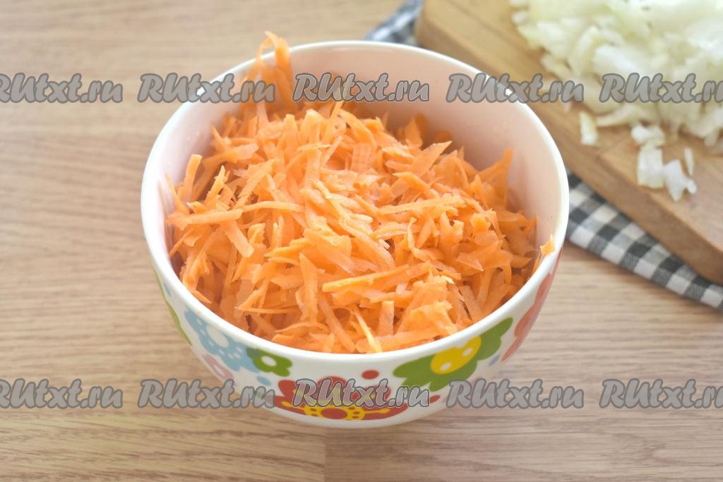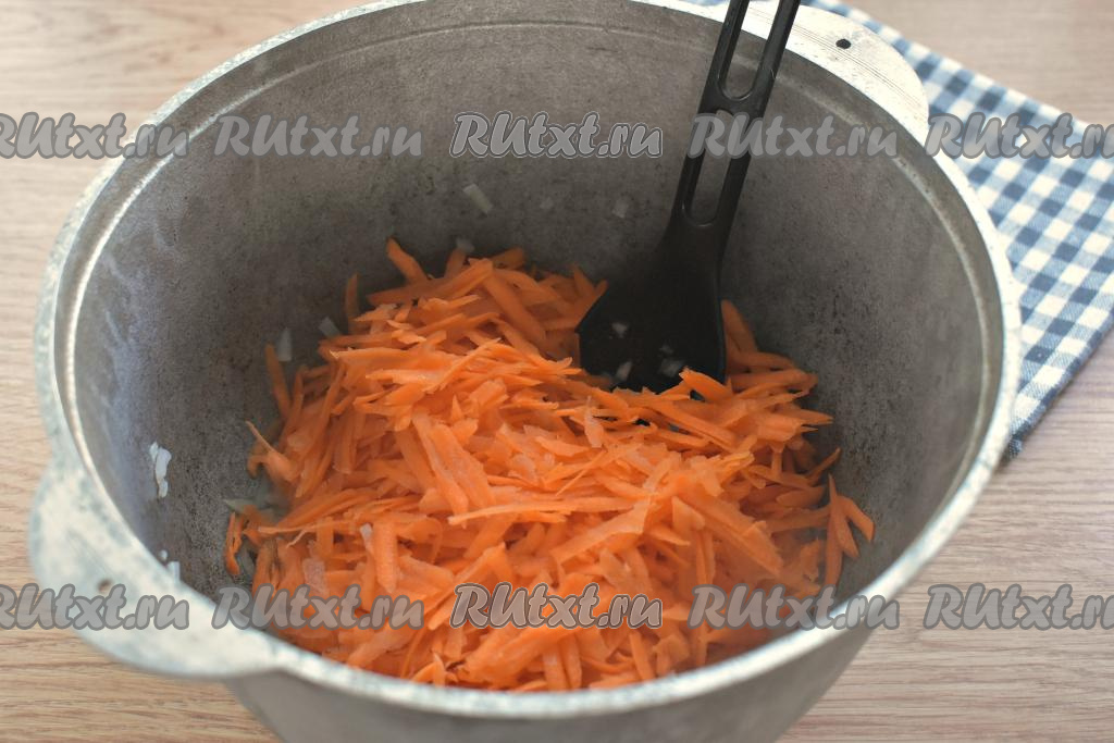 К обжаренному луку выкладываем морковку, перемешиваем, обжариваем 4-5 минут, не забывая периодически овощи перемешивать.