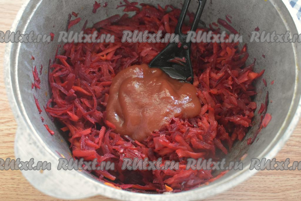 К обжаренным луку, моркови и свекле добавляем томатную пасту и вливаем воду, перемешиваем.