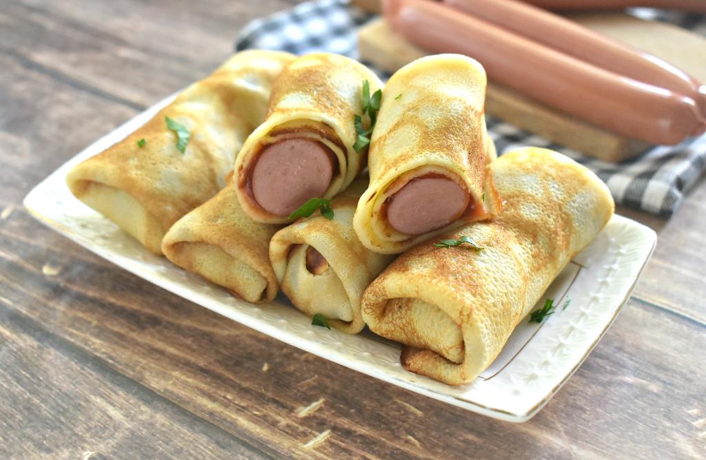 Вкусные, сытные, аппетитные блины с сосисками подаём к столу.