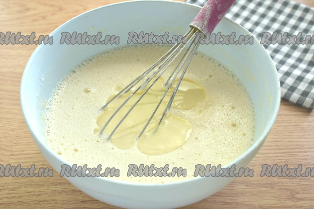 Яйца разбиваем в объёмную миску, всыпаем к ним сахар и соль, взбиваем венчиком (или миксером) до однородности.