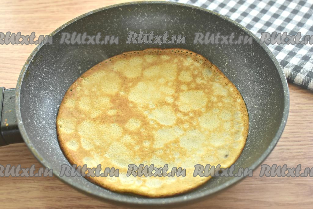 Сковороду смазываем растительным маслом (обычно смазывать сковороду маслом нужно только перед жаркой первого блинчика, так как растительное масло входит в состав теста, но многое зависит от качества покрытия сковороды). Хорошо разогреваем сковороду, смазанную маслом, а затем вливаем половник теста, равномерно распределяем и жарим блин до подрумянивания с двух сторон (ориентировочно по 1 минуте с каждой стороны), перекладываем на тарелку.