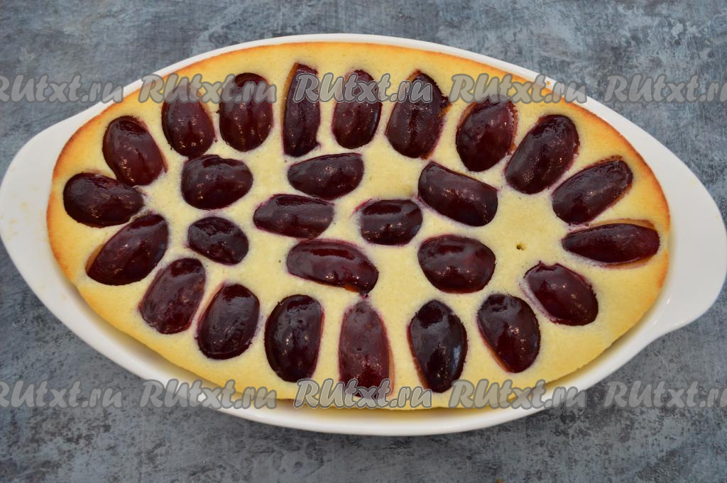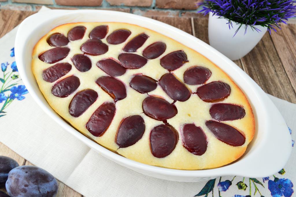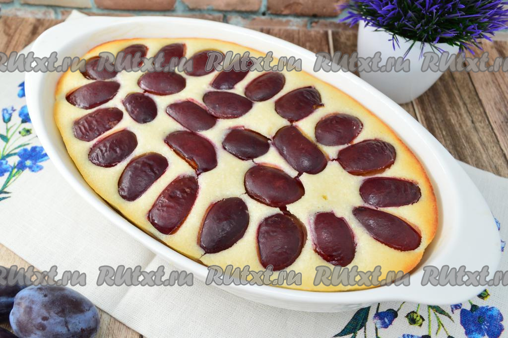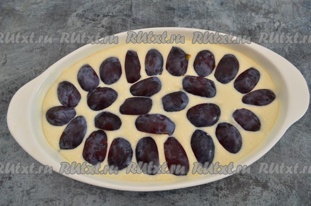 Дно и бока формы для выпечки смазать сливочным маслом (у меня форма овальная размером 16 на 26 сантиметров). Тесто для запеканки ещё раз хорошо перемешать и вылить в подготовленную форму. Кусочки слив разместить сверху, чуть утопив. Кожица должна быть сверху. Поставить форму в хорошо разогретую духовку.